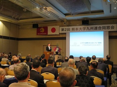 引き続き行われた講演会では、原田学長から『熊本大学の成長戦略~地域に根ざし、世界へ羽ばたく熊本大学へ~』と題した基調講演が、杉山新治氏(トヨタ自動車九州株式会社 技監、昭和49年工学部卒)から『レクサス品質を支える「人?モノ?技術」』と題した特別講演が行われました。