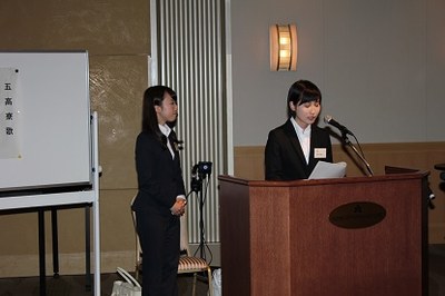 当日は、放送部の高瀬晴菜氏(放送部、文学部2年)と原口佳歩氏(放送部、法学部2年)の司会進行の下、総会が行われ、安田宏正会長(武夫原会理事、昭和42年法文学部卒)、二塚信熊本大学同窓会連合会会長(熊杏会会長、昭和39年医学部卒)からの挨拶のほか、平成27年度の熊本大学卒業生表彰受賞者の紹介、役員等紹介が行われました。