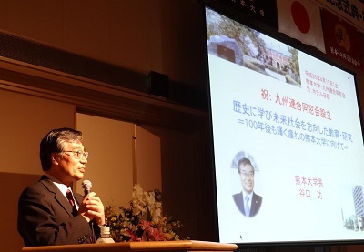 講演会では、谷口学長から『歴史に学び未来社会を志向した教育?研究=100年後も輝く憧れの熊本大学に向けて=』と題した基調講演が行われ、前身となる再春館から数えて258年となる熊本大学の歴史、学習から学修へと質の転換を図る教育、文部科学省に拠点として選ばれた研究、めざましい活躍を見せる学生の課外活動など、多岐にわたる大学の取組が報告されました。