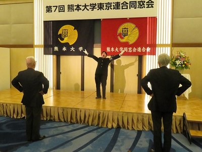 交流会の終盤では、体育会応援団の中村あゆみ氏(応援団リーダー部第44代団長、理学部2年)と応援団OBによる“巻頭言”と“五高寮歌”が披露され、参加者による合唱が高らかに会場に響き渡りました。最後に、今村 遼平副会長(昭和38年理学部卒)から挨拶があり、謝意が述 べられ、盛況のうちに会は終了となりました。